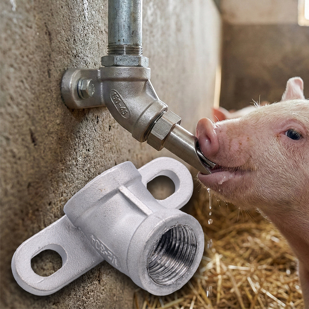 Racord de tip cot la 45° pentru fixarea suzetelor de adăpare pentru porci. Permite o montare sigură și stabilă pe sistemele de adăpare cu filet de 1/2 inch.