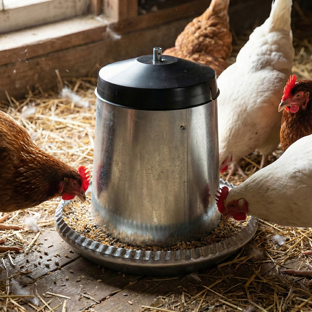 Hrănitoare durabilă din oțel galvanizat, concepută pentru pui și găini. Are o capacitate de 5 litri (aproximativ 4,5 kg de granule) și este suficientă pentru până la 6 găini. Structura robustă asigură stabilitate, iar asamblarea este rapidă și ușoară.