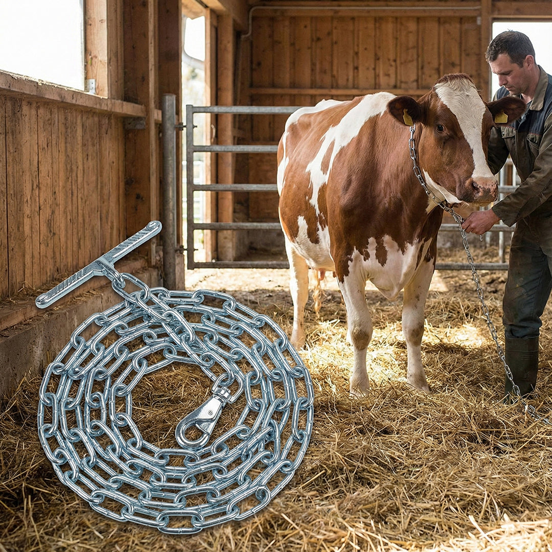 Elementul de lanț este destinat legării și fixării bovinelor, oferind o soluție sigură și rezistentă pentru utilizare în ferme și exploatații zootehnice.