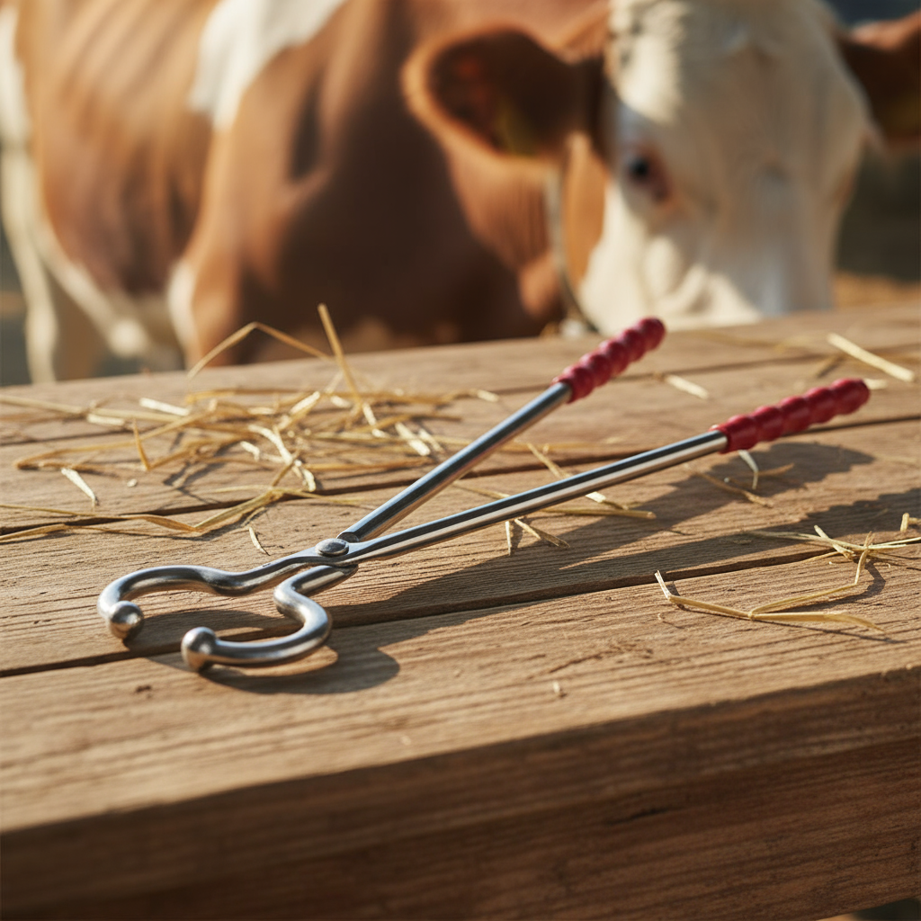 - Mucarniță de tip clește cu mâner de 44 cm, pentru contenție și transport bovine.