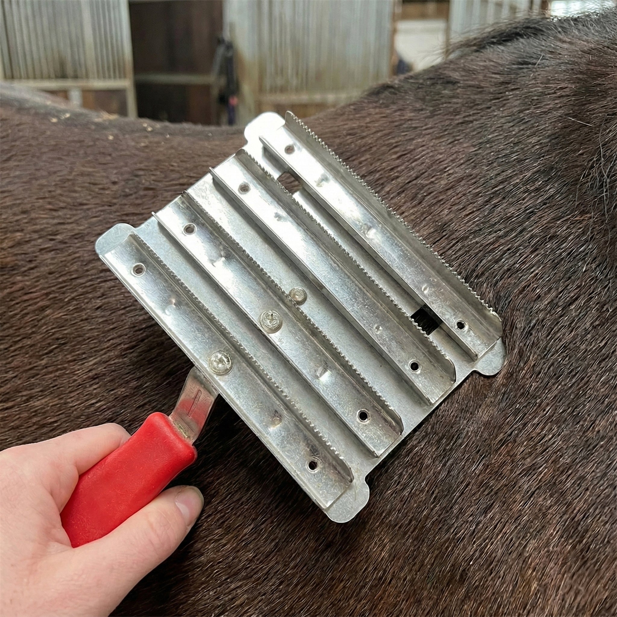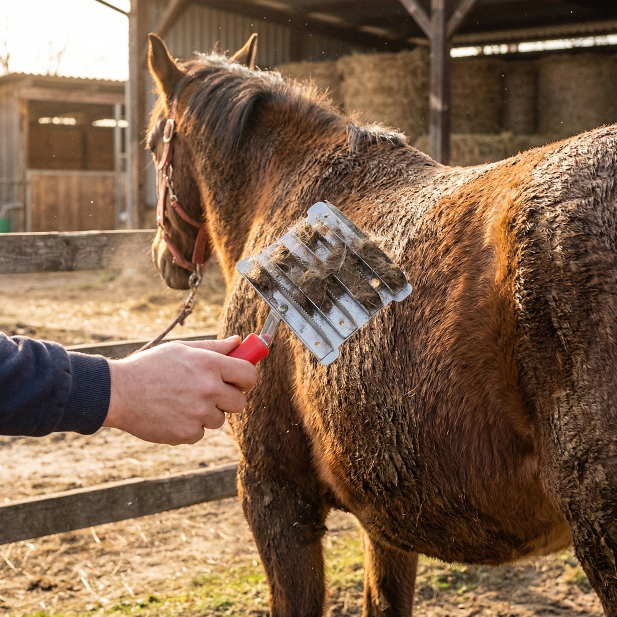 Tesală metalic este robust și prevăzut cu 2 plăcuțe de lovire pentru îndepărtarea murdăriei. Ideal pentru îngrijirea cailor, realizat din metal galvanizat durabil și mâner din plastic ergonomic.