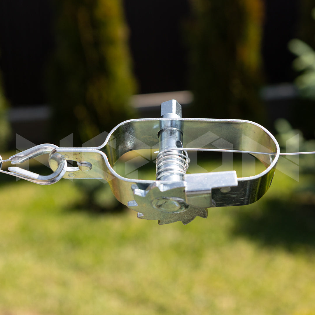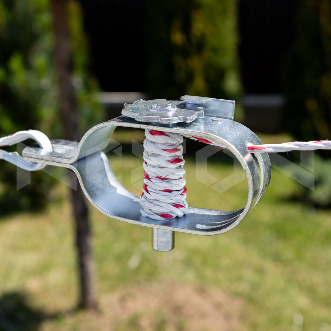 Dispozitiv pentru tensionare, cu sistem de blocare automată. Potrivit pentru sârmă gard electric cu diametrul de 1,6...3mm.